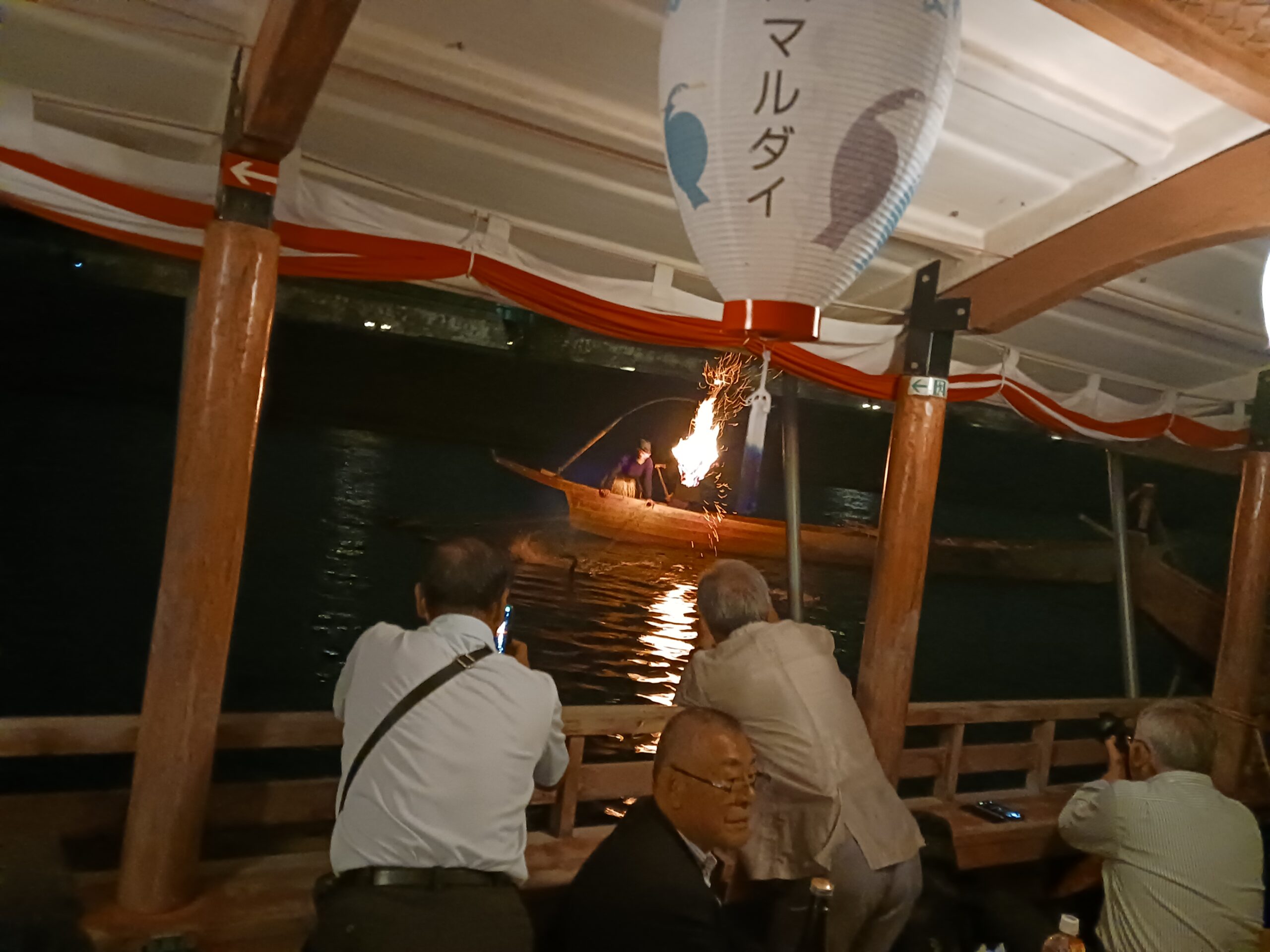 懇親会後は、岐阜開催の目玉「長良川の鵜飼い」。一番の心配は天候でしたが、晴天に恵まれ、少し前までの猛暑が去って快適な鵜飼い日和となりました。地元の私も20年ぶりだったのですが、ライトアップされた金華山頂の岐阜城、穏やかな川面、心地よい川風…。「幽玄の世界へ、燃え盛る篝火は古典絵巻」とパンフレットにありましたが、大げさではなく、そんな趣も感じられました。初めて鵜飼いを味わった皆さんにも満足していただけたようです。